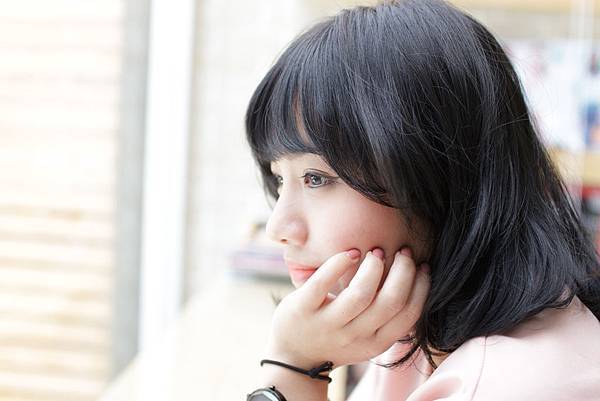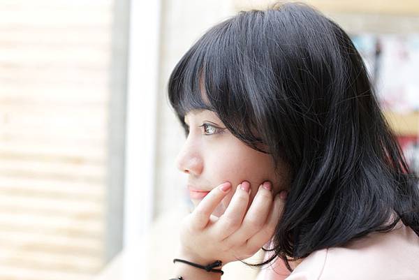 獨特的墨綠灰髮色,透過窗邊陽光灑下的光線中